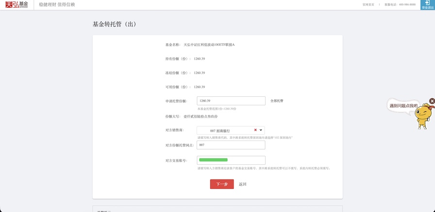 确认无误后,点击下一步,并在弹出的窗口中再次确认,就提交好了。然后就是等基金平台确认托管转出交易。如果确认失败,可以到基金平台找人工客服凭姓名和身份证号查询失败原因。